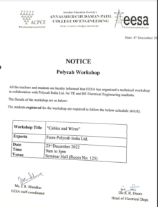 Electrical Engineering Students Association (EESA) organizes a technical workshop on “Cables and Wires” in collaboration with Polycab India Ltd. on 21st December 2022.
