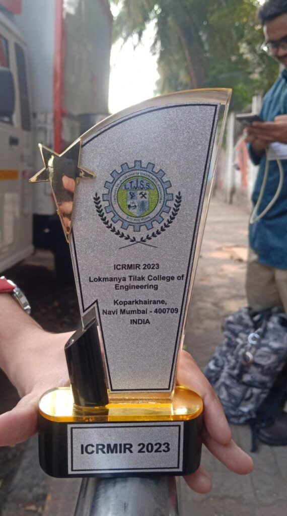 Final year IT department students, Yash Margaje, Akshay Kanade, Shamika Mhatre, Suyog Morankar for receiving best paper award in 1st International Conference on Recent Trends in Multidisciplinary Research and Innovations (ICRMIR -23) on 17 – 18th March 2023, organized by Lokmanya Tilak College of Engineering, Navi Mumbai.